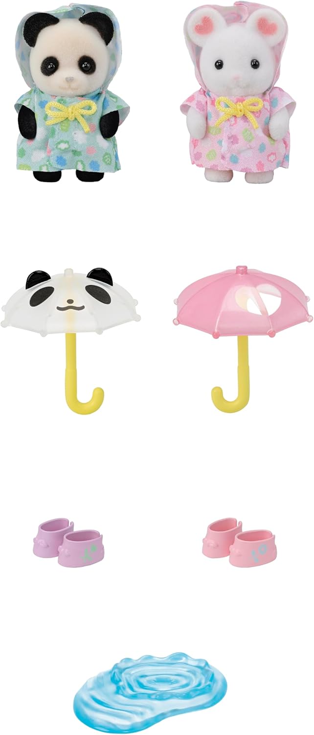 Set vključuje prikupne dežnike, gumijaste škornje in celo lužo – popolno za igro v deževnem dnevu. Dežniki se prilegajo dojenčkovim rokam.