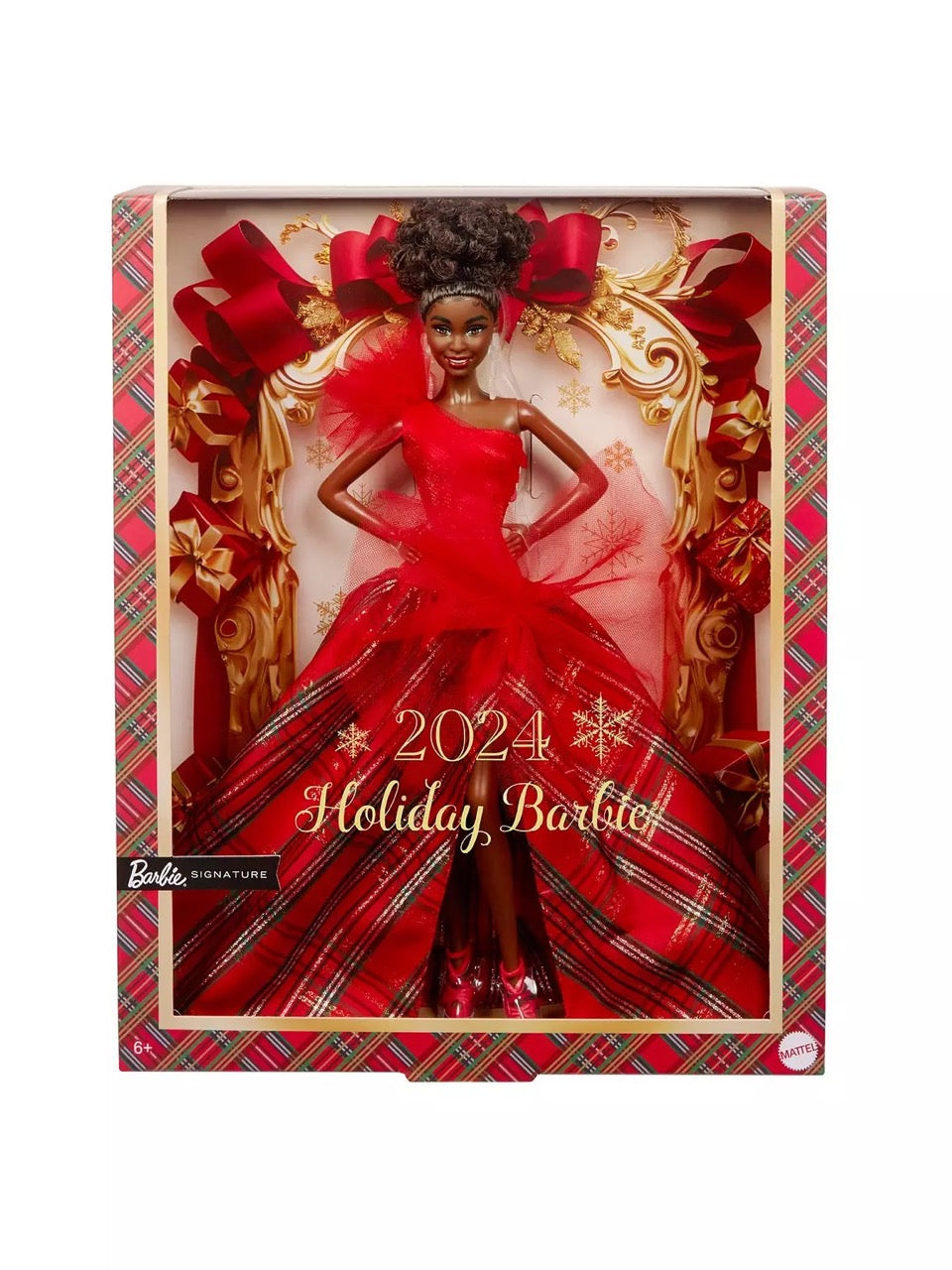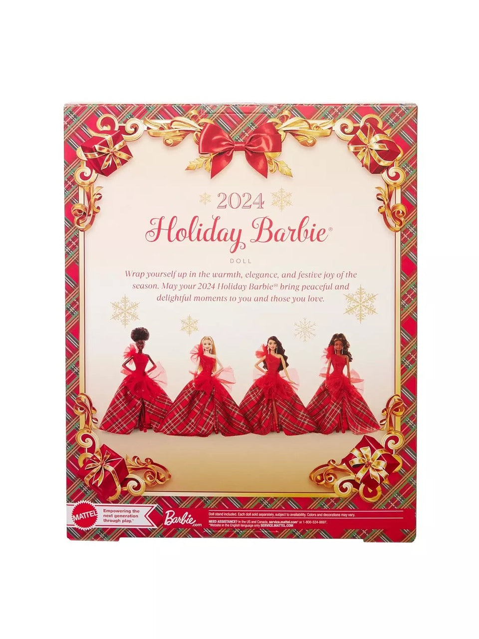 2024 Holiday Barbie punčka izžareva toplino in ljubezen prazničnega časa s svečano obleko in prazničnim videzom! Obleka ponuja čudovito dramo, saj se združita padajoči rdeč bodi z enim ramenom in polna karirasta krila v stilu baletne obleke. Veliki tulle detajli so sodoben pogled na klasičen videz.
