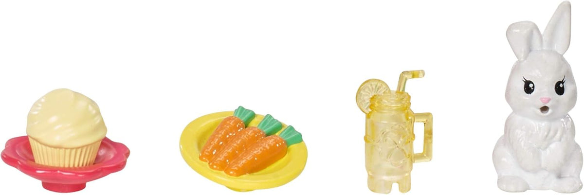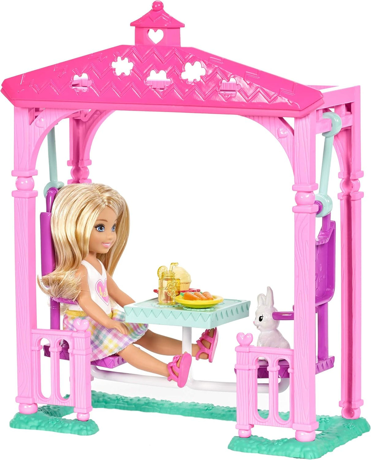 Lutka Chelsea in njen ljubki zajček lahko uživata v swinging slogu v tem piknik paviljonu, prijaznem do hišnih ljubljenčkov. Ima mizo in dve stoli, ki služita tudi kot gugalnice – samo potisnite, da začnete akcijo!