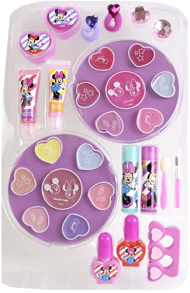 Super nahrbtnik Minnie Mouse, visok 30 cm in širok 19,5 cm. Vsebuje polnovredno kozmetiko: 2 rdečili za lica, 2 bleščila, 2 gumici za lase, 2 kristalna prstana, paleto s 7 bleščili, paleto s kremnimi senčili za oči, 2 šminki, 2 bleščeča laka za nohte (rdeč in roza), separator, aplikator, čopič.