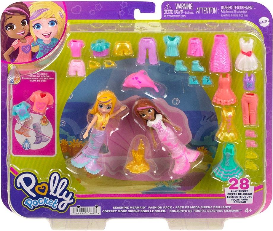 Otroci lahko pokažejo svoj stil s Polly Pocket™ modnimi paketi, napolnjenimi z oblačili in dodatki za lutke. Ta paket z morsko deklico vključuje dve lutki in 25 modnih kosov — dva dodatka imata spremembo barve! Ljubitelji mode jih lahko zbirajo in mešajo oblačila na poti. Vsak modni paket se prodaja posebej, odvisno od razpoložljivosti. Barve in dekoracije se lahko razlikujejo.
