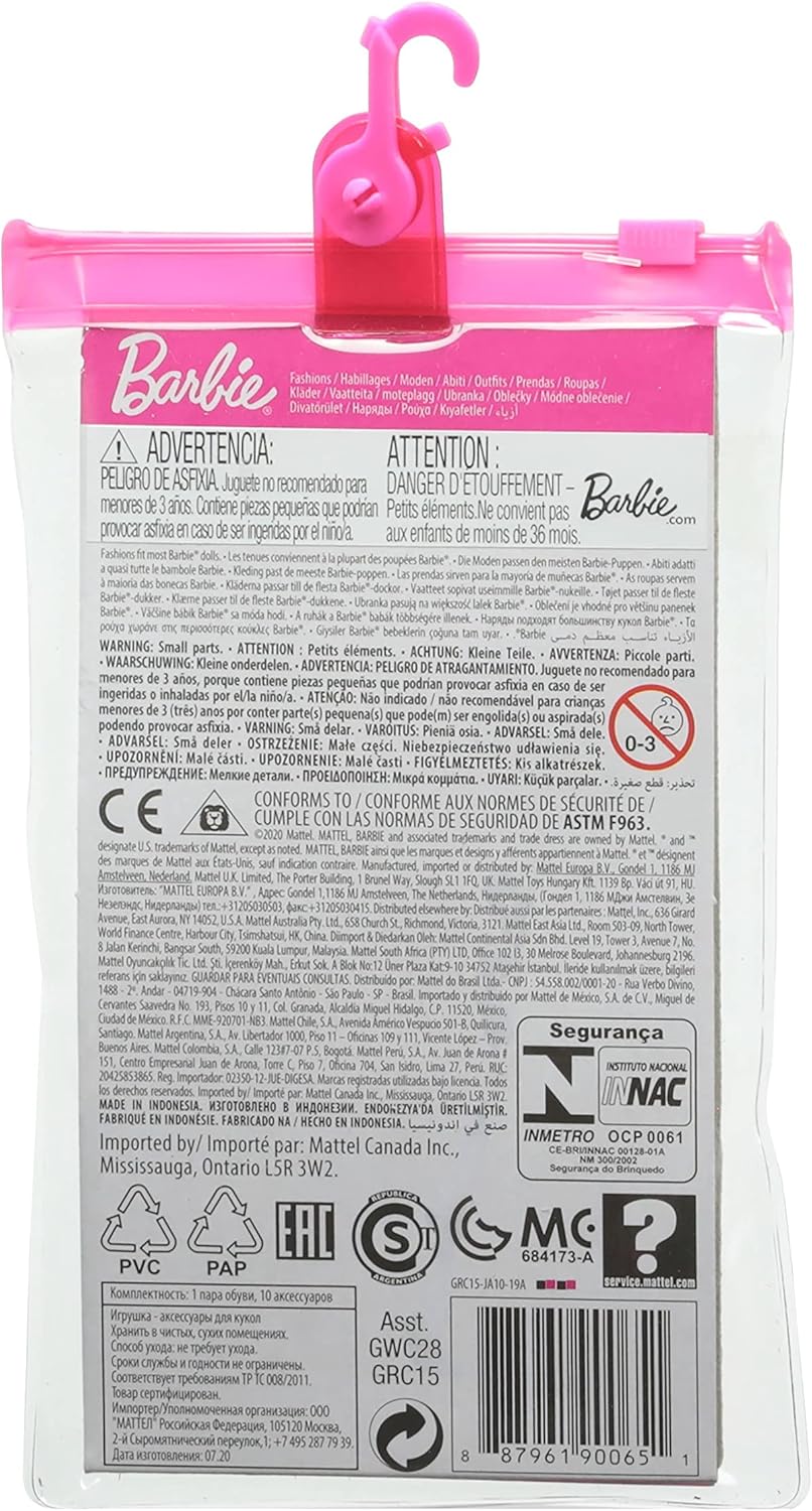 Vključuje modne dodatke, kot so visoke pete s paščki, torbico v obliki ustnic, krtačo za lase, šminko in stekleničko parfuma – vse, kar Barbie® potrebuje za nepozaben večer.