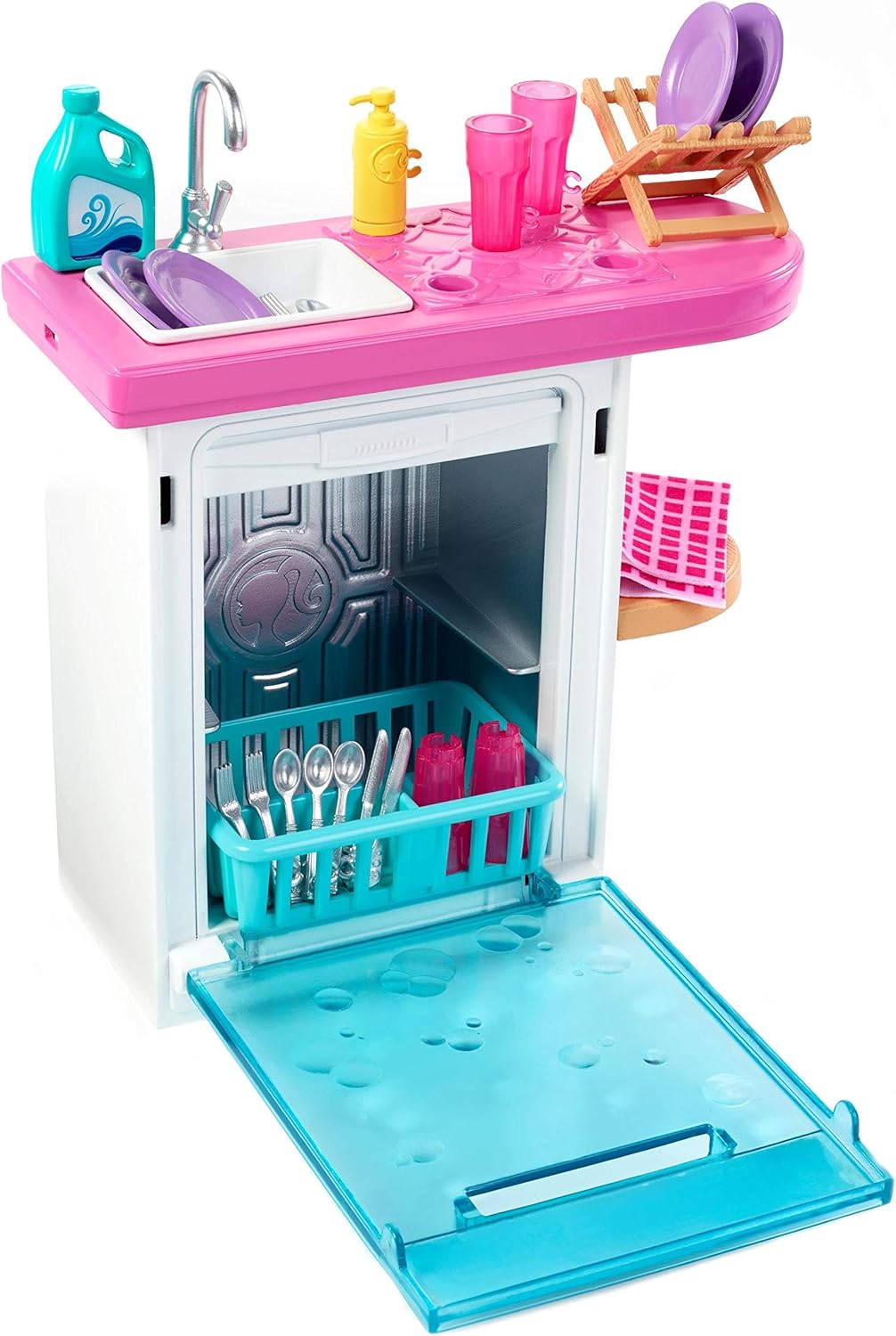Pustite domišljiji prosto pot s setom pohištva Barbie, ki naredi čas igranja še bolj zabavnim! S prozornimi vrati, ki jih lahko odprete in zaprete, ter košarico, ki jo lahko potegnete naprej in nazaj, set pomivalnega stroja spremeni običajno opravilo v zabavno izkušnjo. Veliko posode pomeni veliko zgodb – postavljajte in jemljite krožnike, skodelice in pribor znova in znova. Na voljo so tudi dodatni pripomočki, kot so steklenica detergenta za pomivanje, krpa za pomivanje in krpa za sušenje, ki jih otroci lahko uporabijo med igro.