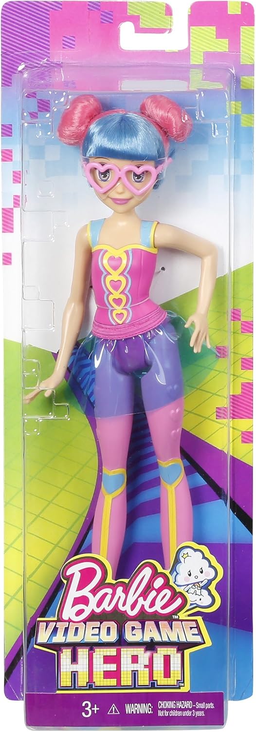 Bodi igralna prelomnica z lutko Barbie®! Navdihnjene z novimi prijatelji iz Barbie™ Video Game Hero™, so te lutke pripravljene, da se aktivirajo, napredujejo in spremenijo igro! Izberite med dvema anime likoma, ki pomagata Barbie™ doseči njen cilj. Vsaka nosi značilno obleko v svetlih neon barvah in slogu video iger. Ena lutka video igričarke dobi točke v vijoličnem korzetu z barvitim zvezdnim grafičnim motivom, črnimi legicami z barvitimi zvezdami na kolenih, oranžno vinilno krilo in modrimi dirkaškimi čevlji; njena sestra prevladuje v roza korzetu s svetlimi srčki, roza legicami s srčki na kolenih, modrim vinilnim krilom in rumenimi čevlji. Barvite pričeske in dodatki, kot so očala v obliki srca in slušalice, dopolnjujejo anime videz. Mladi igralci bodo oboževali obnavljanje svojih najljubših prizorov ali ustvarjanje novih zgodb! Zberite vse Barbie™ Video Game Hero™ lutke za celoten cast likov iz video iger (vsaka se prodaja posebej, odvisno od razpoložljivosti). Vključuje lutko Barbie™ Video Game Hero™ prijateljico, oblečeno v modne kose in dodatke. Lutke ne morejo stati samostojno.