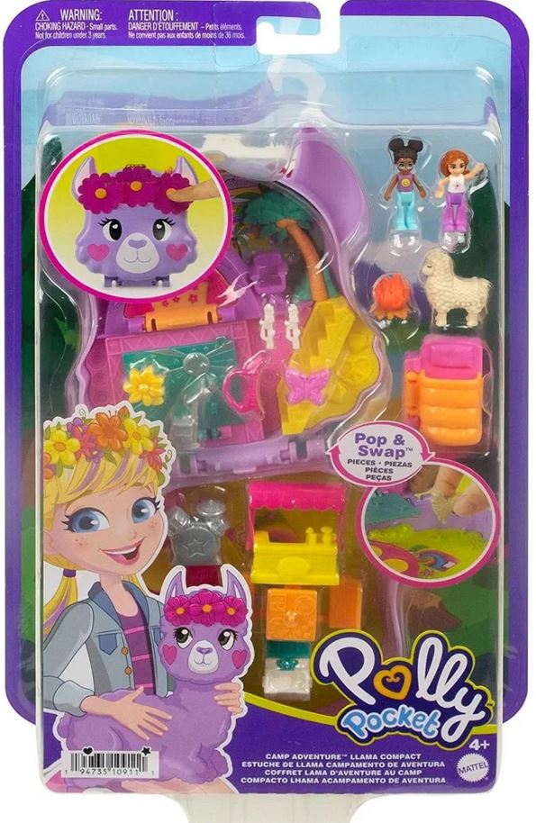 Se pripravi na nepozabno kampiranje z Polly Pocket™ Camp Adventure™ Llama Compact! Ta čudovita kompaktna igrača v obliki lame z rožnatim venčkom in prijetno na dotik zagotavlja neskončno zabavo. Odpri jo in odkrij dve mikro punčki, pet gibljivih funkcij in 13 dodatkov, med katerimi so nekateri z funkcijo Pop and Swap™. Postavi kamp, speči s'mores z prijatelji ali zapleši na odru — otroci lahko zbirajo vse Pocket World kompakte in širijo zabavo! Idealno za otroke od 4. leta naprej. Vsaka igrača je prodajana ločeno, odvisno od razpoložljivosti. Barve in okrasitev se lahko razlikujejo.