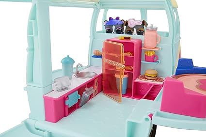 Barbke lahko začnejo zabavo z drsenjem po odrski strani kamp prikolice in premaknejo mizo ter stole na zunaj, da ustvarijo groovy čas. Kamp prikolica 5-v-1 sprejme vse vaše najljubše LOL Surprise barbke in hišne ljubljenčke. Ko končate z igro, lahko vse dodatke shranite znotraj, zato je enostavno vzeti na pot.