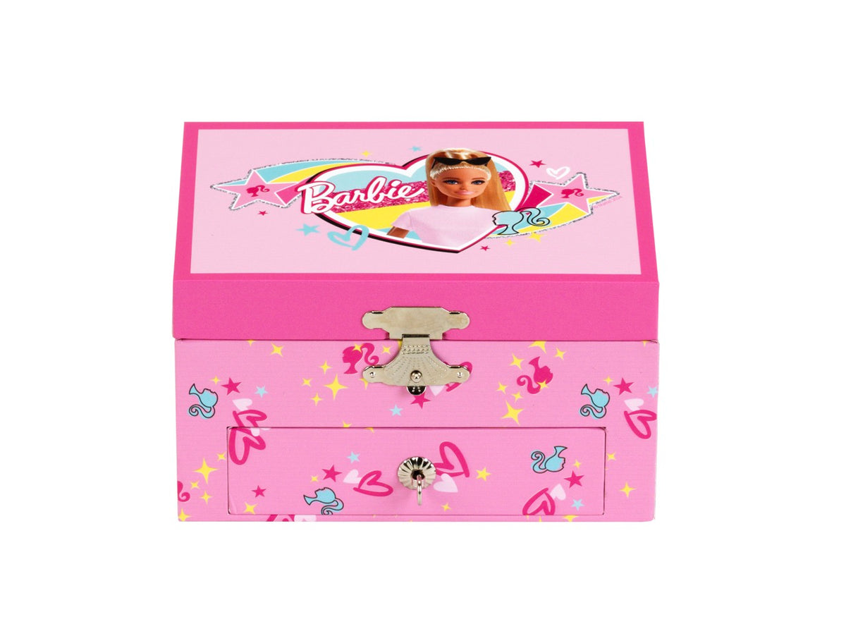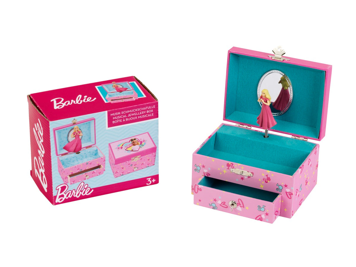 Oboževalke Barbie bodo na prvi pogled vzljubile to škatlo za nakit! Dvignite lep pokrov in graciozna mala balerina Barbie se elegantno zavrti v krogu ter pleše ob čarobni melodiji. Vse, kar morajo mlade oboževalke lutk narediti, je, da navijejo mehansko glasbeno skrinjico z zlatim ključem. Pred njimi se odpre sanjski svet, ki ima tudi veliko praktičnih vidikov. Barbie nakit, čevlji, ogledala, krtače za lase in glavniki - vse to in še več lahko Barbie mamice in očetje shranijo v škatlo. In vsakič, ko nekaj vzamejo iz nje, jih nežna glasba popelje v domišljijski, čudovit svet Barbie.