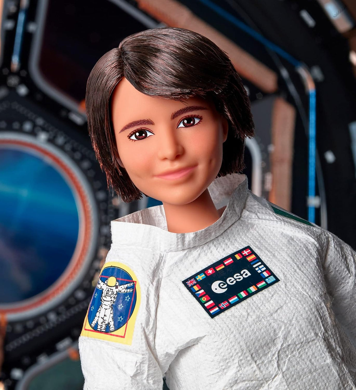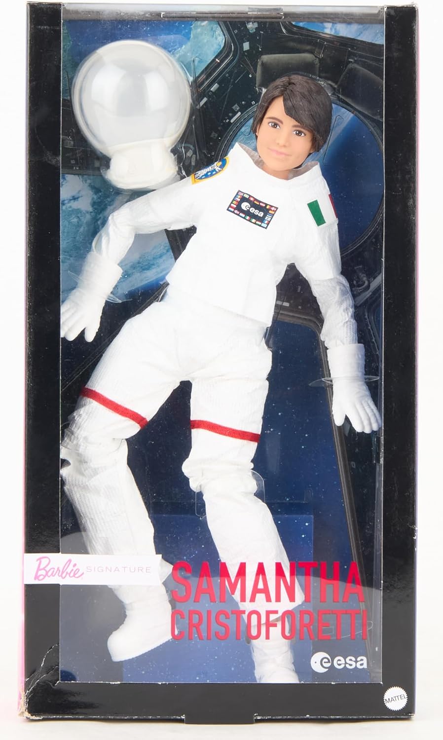Barbie lutka Samantha Cristoforetti, astronavtka ESA, je pripravljena na vzlet v svoji vesoljski obleki s čelado in škornji.