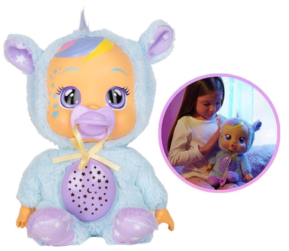Cry Baby Goodnight Starry Sky Jenna ima posebne funkcije, ki naredijo čas za spanje pomirjujoč in čaroben. Ko ji vzamete dude, začne jokati z lučkami, ki svetijo, in oddaja realne zvoke dojenčka. Če ji vrnete dudo, preneha jokati. S pritiskom na njeno mehko trebušček se aktivira projekcija zvezdnega neba, ki prikazuje zvezde in luno v katerem koli prostoru. Poleg tega predvaja več kot 10 minut pomirjujočih uspavank, ki ustvarijo sproščujoč ambient za spanje.
