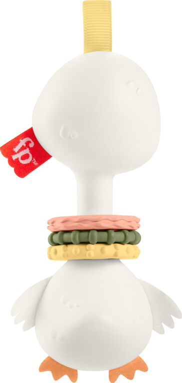 - Igrača za dojenčke v obliki goske z enostavno primernim telesom in teksturiranimi obroči za senzorično igro