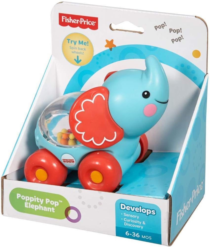 Navdušujoče dogajanje, zabavni zvoki in sijoči odsevi spodbujajo otroka, da se vedno znova plazi ter potiska slončka. Slon Fisher-Price® Poppity Pop ™ je popolne velikosti za oprijem in držanje majhnih rok.