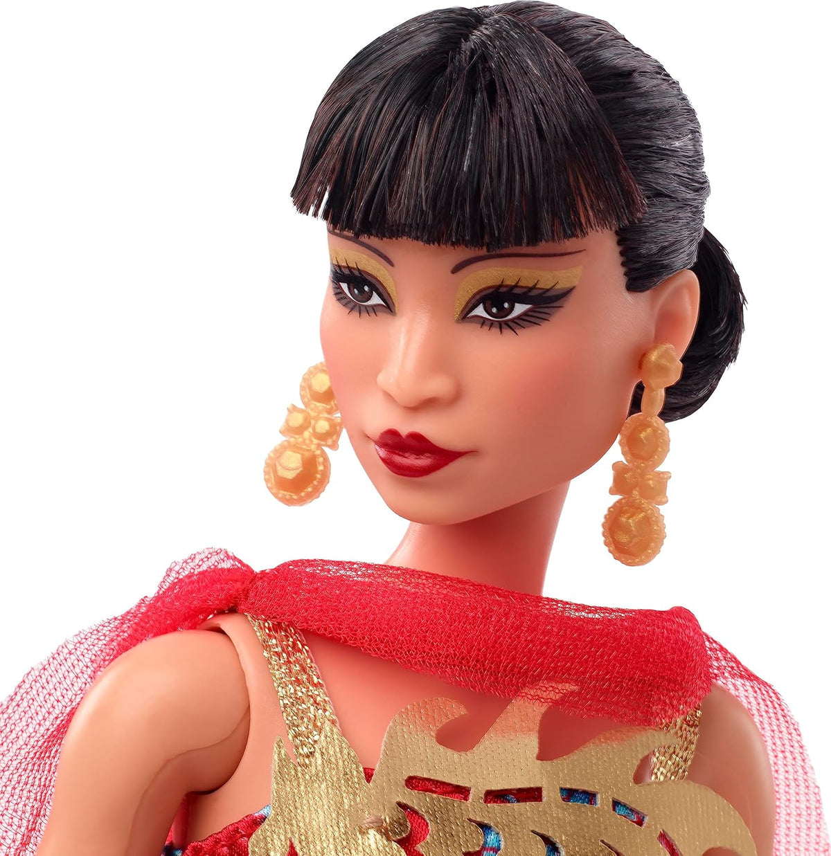 - Barbie lutka Anna May Wong nosi bogato rdečo obleko z zlatim zmajem na korzetu. Bleščeče zlate naramnice in prosojna ogrinjala z drapiranim izrezom dopolnjujejo eleganten videz.