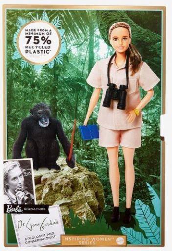 Cena na enoto ZaSerija Barbie Inspiring Women časti neverjetne junakinje njihovega časa: pogumne ženske, ki so tvegale, spreminjale pravila in utrle pot generacijam deklet, da sanjajo še večje sanje. V čast desetletjem predanosti, prelomnim raziskavam in herojski dosežkom kot okoljevarstvenica, strokovnjakinja za vedenje živali in aktivistka, Barbie posveča posebno kolekcionarsko lutko dr. Jane Goodall, DBE, ustanoviteljici Jane Goodall Institute in Poslanici miru Združenih narodov. Lutka je narejena iz reciklirane plastike. Skupaj z opico David Greybeard, lutka Barbie Dr. Jane Goodall nosi terensko obleko ter je opremljena z daljnogledom in zvezkom.