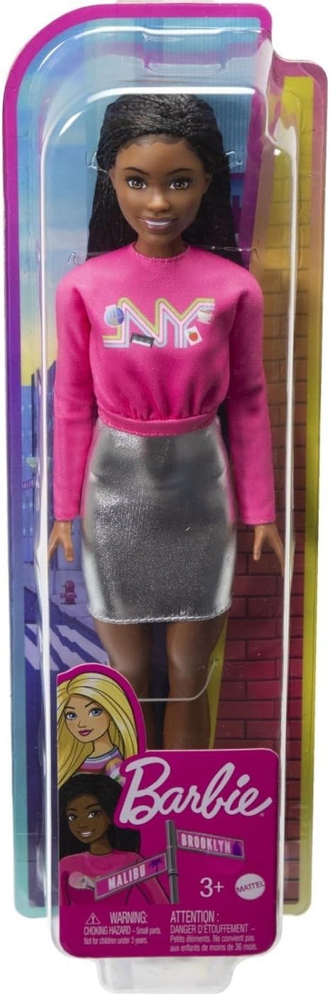 - Barbie® 'Brooklyn' Roberts lutka izgleda prav kot njen ekran karakter, v roza majici z grafiko NYC in trendovskem srebrnem metalnem krilu.