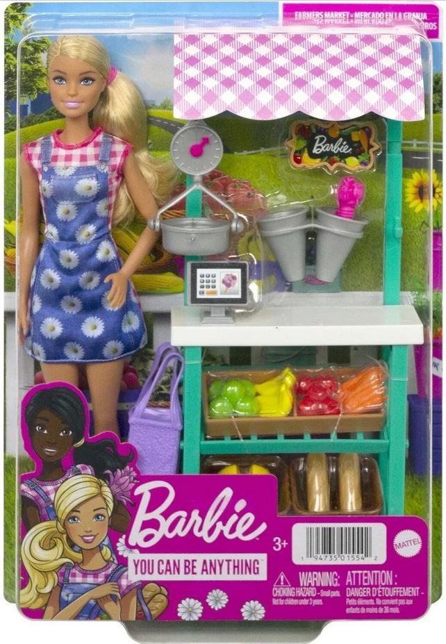 Raziščite svet nakupovanja z Barbie® Farmers Market igralnim setom. Barbie® lutka (blondinka/29 cm) nosi prikupno obleko s karo vzorcem in cvetličnim predpasnikom, poleg tega pa dolge roza škornje, in je pripravljena pomagati strankam. Tržnica ima streho s karo vzorcem in police z dvema košarama, ki vsebujejo sadje, zelenjavo, sir in kruh. Tu je tudi posoda za rože, kjer lahko prodaja sveže cvetje. Barbie® lutka lahko stehta zelenjavne izdelke na tehtnici z dejanskim premikajočim se kazalcem, jih zapakira za stranke in zabeleži nakup na blagajni. Set vključuje stojalo na tržnici, sadje, zelenjavo, sir, kruh, rože, nakupovalno torbo in blagajno.
