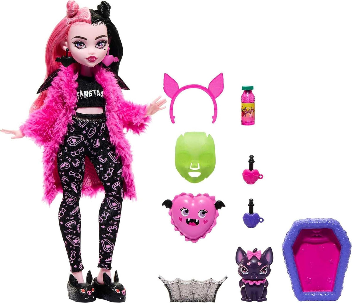 - Slog in Tematski Dodatki: Lutka Draculaura™ se ponaša z detajlno obleko in dodatki za zabavo, ki so tematsko povezani z njenim edinstvenim "scaritage-om". Njen mehki kardigan je srčasto udoben! Nosila ga bo čez kratko majico in tiskane legice z mrežastimi detajli ob pasu. Ta vampirka je izjemno stilna s svojimi vesoljnimi bunami in neskladnimi velikimi uhani! Izgled dopolnjuje z roza naglavnim trakom z netopirskimi ušesi in strašno ljubkimi natikači v obliki netopirja.
