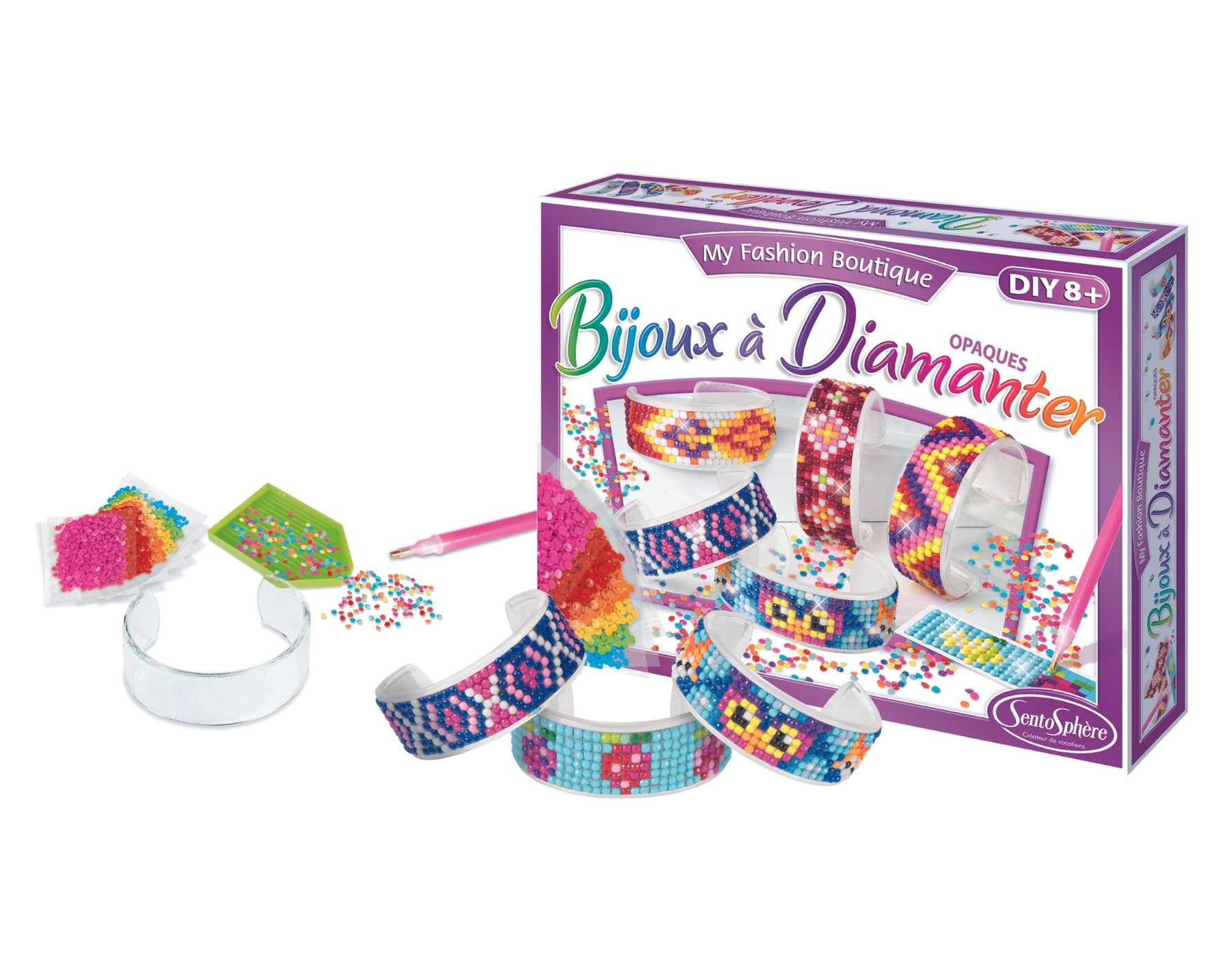 Ustvarite 6 zapestnic z geometrijskimi in barvitimi vzorci! Enostavno jih je ustvariti in nositi, prav tako pa so popolne za darila. Vsak kvadraten neprozoren diamant pobirate s pomočjo lepilnega peresa in jih nameščate na lepljivo platno po vzorcih. Ko končate, na vrh dodajte nekaj laka, da vse skupaj drži na mestu, in svojo čudovito stvaritev pritrdite na eno od 6 priloženih akrilnih podstavkov. Odlična dejavnost za mlade modne navdušenke in matere!