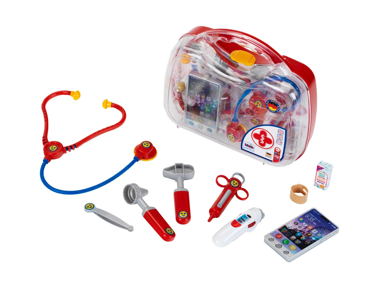 Moderen zdravniški kovček je popolna oprema za vse tiste, ki radi rešujejo plišaste živali in nudijo prvo pomoč. S kliničnim termometrom, stetoskopom, brizgo, ušesnim ogledalom in refleksnim kladivom so bolni punčke in plišaste igrače temeljito pregledane v trenutku in hitro okrevajo. Električni monitor srčnega utripa je še posebej koristen pri diagnostiki. Če se stvari ne izidejo dobro, je pomoč mogoče hitro poklicati s pametnim telefonom. Po desetletjih izkušenj je Theo Klein kovčke in instrumente optimalno prilagodil otroškim rokam, s zaobljenimi robovi in priročnim ročajem. Robusten in izdelan iz visokokakovostne plastike. Optimalen za ustvarjalne igre, ki mimogrede trenirajo motorične spretnosti.