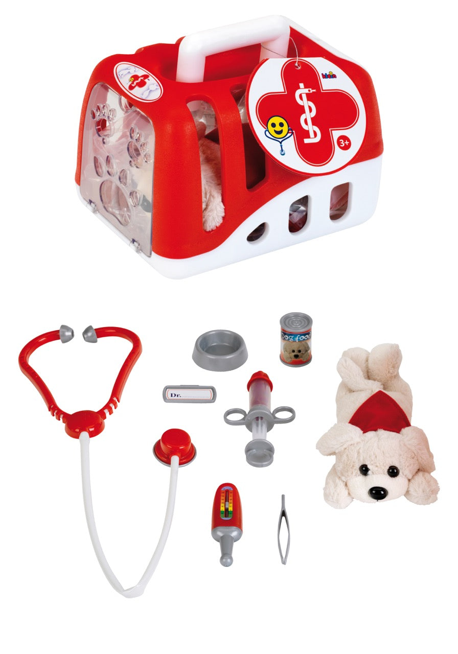 Ta robusten transportni kovček s praktičnim ročajem vsebuje srčkanega plišastega psa in njegovo posodo ter celovit nabor veterinarskih instrumentov: stetoskop, brizgo, termometer, pinceto, značko z imenom in pločevinko.