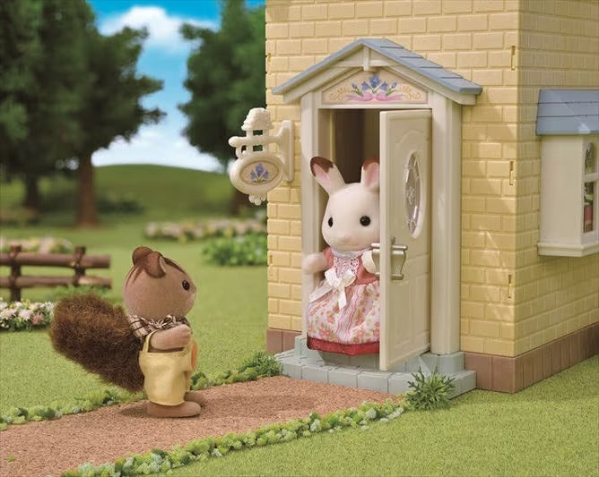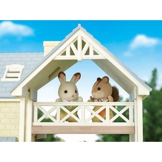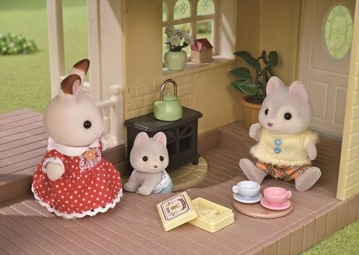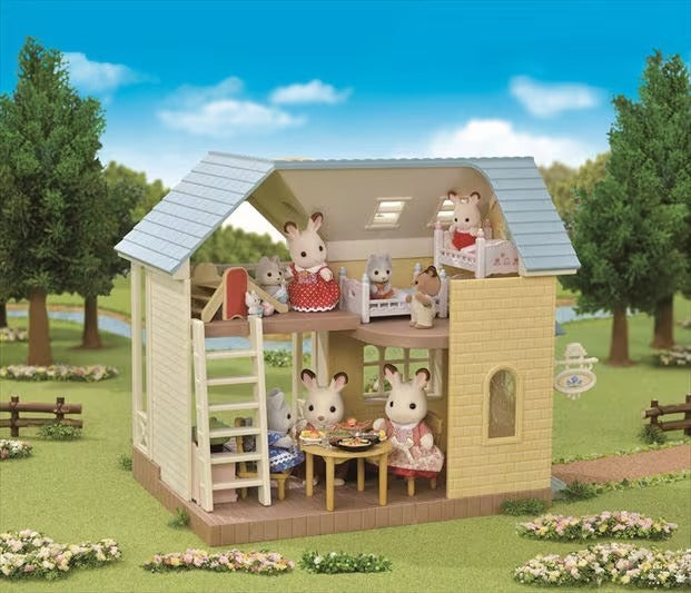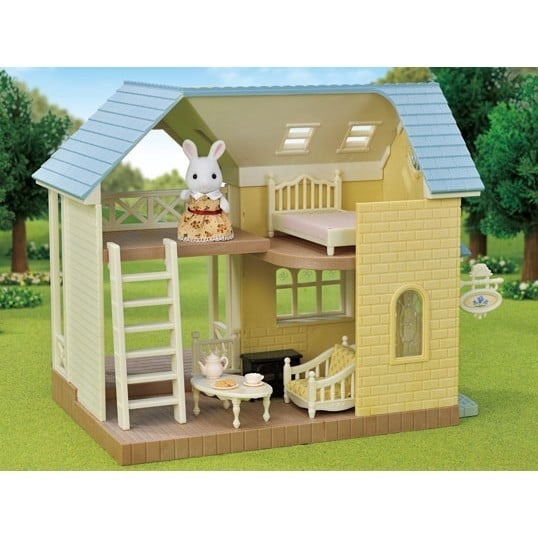 V notranjosti je peč na drva, zgornje nadstropje pa služi kot simpatična podstrešna spalnica za vaše gostujoče družinske člane. Darilni komplet vključuje tudi posteljo, komplet s foteljem in mizo ter figurico zajčje sestrice.